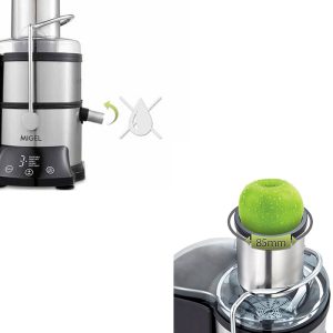 دهانه ورودی آبمیوه گیری میگل مدل GPJ 802 بزرگ طراحی گردیده تا بتوان میوه ها را با قطر زیاد و بدون برش در آن قرار داد. آبگیری توسط تیغه استیل ضد زنگ انجام می گیرد و تفاله آن به مخزنی با گنجایش 2 لیتر منتقل می شود که این مقدار برای استفاده های روزانه با حجم زیاد و بدون نیاز به تخلیه تفاله، ظرفیت ایده آلی است.