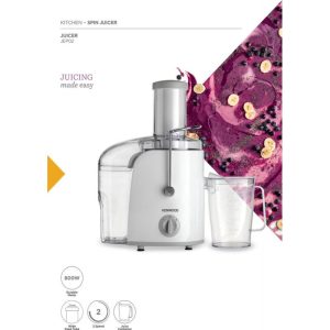 دستگاه آبمیوه گیری JEP02 ساخت شرکت کنوود که از توان موتور 800 وات بهره مند بوده و به عنوان یک آبمیوه گیری تک کاره توسط این شرکت به بازار عرضه شده است. بنده این دستگاه از جنس پلاستیک بوده که جنس مرغوب و باکیفیتی را به همراه داشته و ایمنی بدنه را تضمین میکند. همچنین قسمت بالایی این دستگاه به صورت شفاف بوده که باعث میشود شما بدون نیاز به باز کردن در آن به نحوه عملکرد دستگاه نظارت داشته باشید.