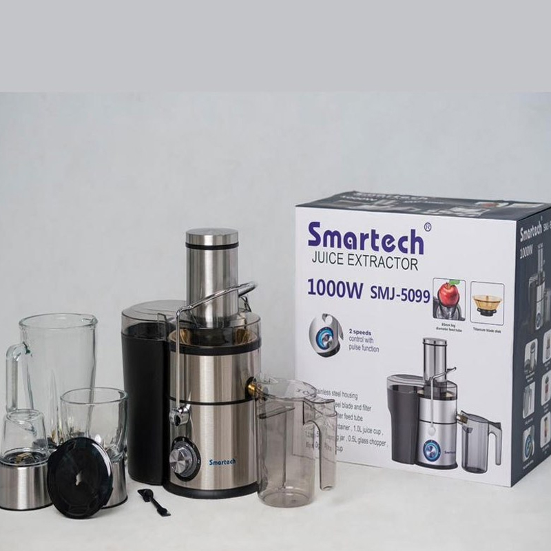 آبمیوه گیری ۴ کاره اسمارتک مدل SMJ-5099 دستگاهی خارق العاده و همه چیز تمام با توان 1000 واتی هست که امکان تهیه بدون دردسر انواع مختلف آبمیوه را دارد زیرا آبمیوه گیری ۴ کاره اسمارتک مدل SMJ-5099 دهانه 85 میلی متری دارد و از طرفی با بدنه و پایه های استیل ضد زنگ شامل خردکن، مخلوط کن و آسیاب نیز هست تا با یک دستگاه بتوان هر نوع نیازی را برآورده کرد و آن هم با قیمتی که چند بار در کافی شاپ نوشیندی میل کنید برابری می کند و از هر لحاظ شما باید یک آبمیوه گیری ۴ کاره در خانه خود داشته باشید.
