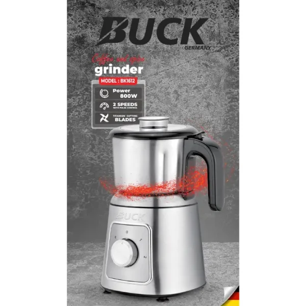 آسیاب باک مدل BK1612 با موتور ۸۰۰ وات و تیغه استیل ضدزنگ، مناسب برای آسیاب انواع مواد غذایی خشک با طراحی کمحجم و کاربری ساده.
