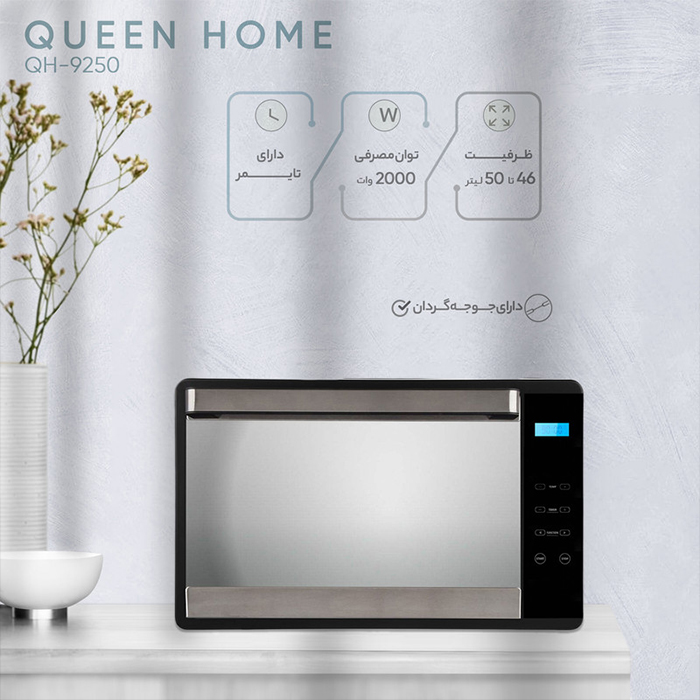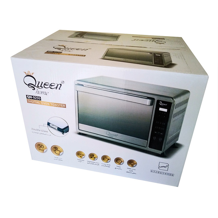 توان مصرفی این اون توستر دیجیتالی 50 لیتری، 2000 وات است و دمای آن بین 100 تا 250 درجه سانتی گراد قابل تنظیم می باشد. همچنین درب آون توستر کوئین هوم مدل QH-9250 به صورت دو جداره مقاوم در برابر حرارت ساخته شده تا مانع از اتلاف انرژی گردد.