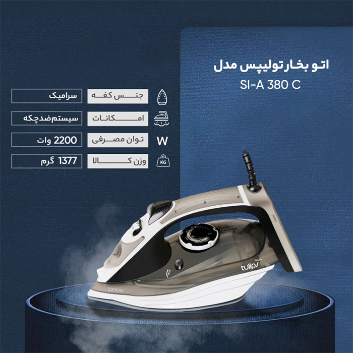 اتو بخار تولیپس مدل SI-A380C یکی از جدیدترین محصولات شرکت صنایع الکتریکی ناسیونال ایران می باشد.اتو بخار تولیپس مدل SI-A380C دارای کفی سرامیکی با کیفیت است که علاوهبر منافذ خروج بخار و مسیرهای بخار و مجهز بودن به سیستم ضدچکه، دارای قطع کن خودکار نیز میباشد .