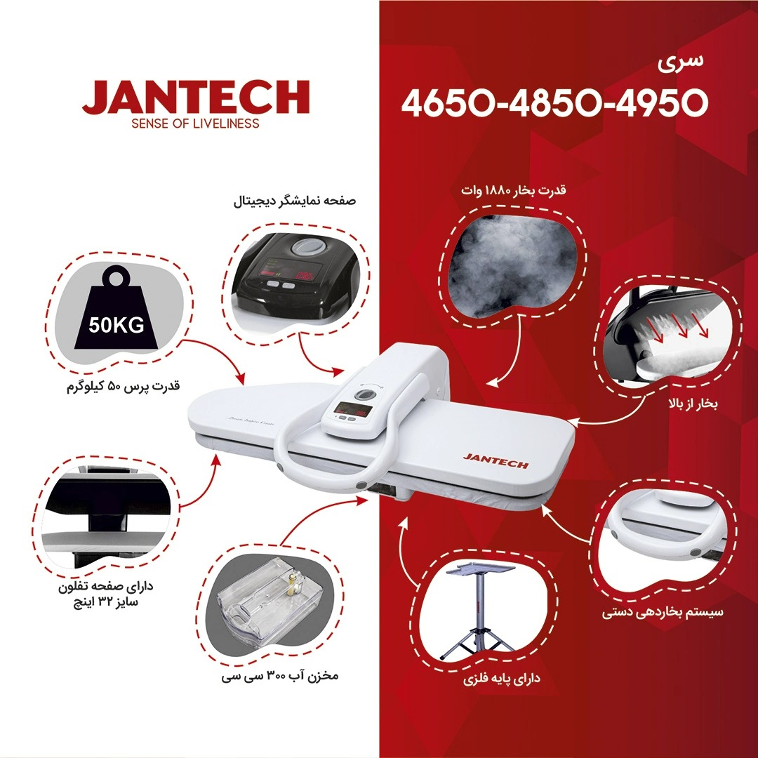 اتو پرس جانتک مدل 4950 دستگاهی حرفهای با قدرت بخار 1880 وات و خروجی بخار 90 گرم در دقیقه است که در مدت 3 دقیقه آماده به کار میشود. این اتو پرس دارای سیستم بخار از بالا بوده و کفه آن از جنس فلز با طول صفحه 32 اینچ (حدود 90 سانتیمتر) است که فضای گستردهای برای اتوکشی انواع لباسها فراهم میکند. قدرت پرس دستگاه 50 کیلوگرم است که امکان اتوکشی پارچههای ضخیم و حجیم را به راحتی میسر میسازد.