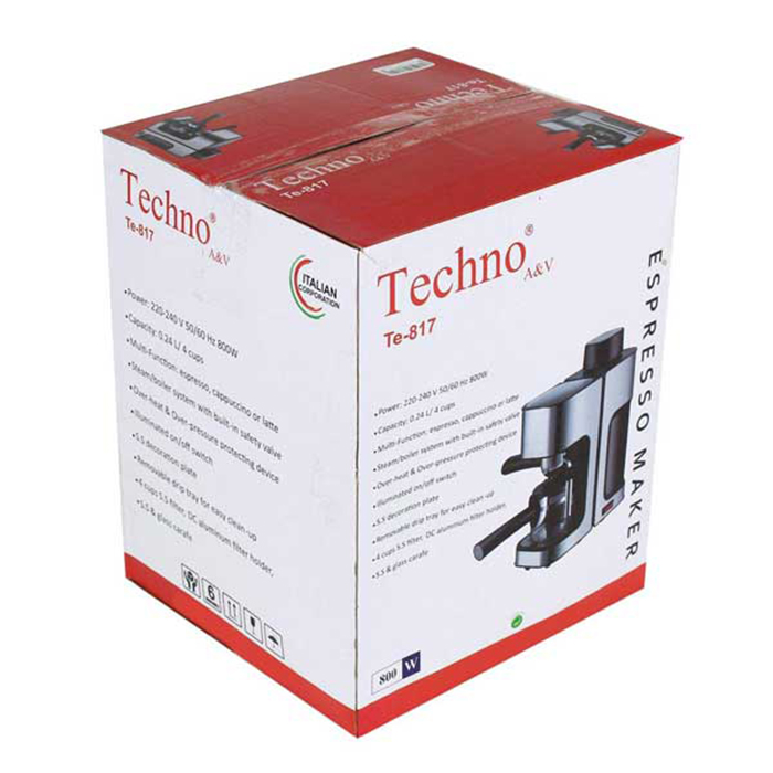 اسپرسو ساز تکنو مدل Te-817 با ظاهری زیبا و منحصر به فرد طراحی شده و با توجه به کیفیت ساختی که دارد، برای مصارف خانگی و یا کافه های کوچک انتخاب بسیار مناسبی می باشد. اسپرسو ساز تکنو مدل Te-817 با توان 800 وات و فشار پمپ بخار 3.5 بار قادر است، در مدت زمان کوتاهی انواع نوشیدنی هایی همچون اسپرسو، کاپوچینو و لاته را با حفظ طعم واقعی تهیه نماید.