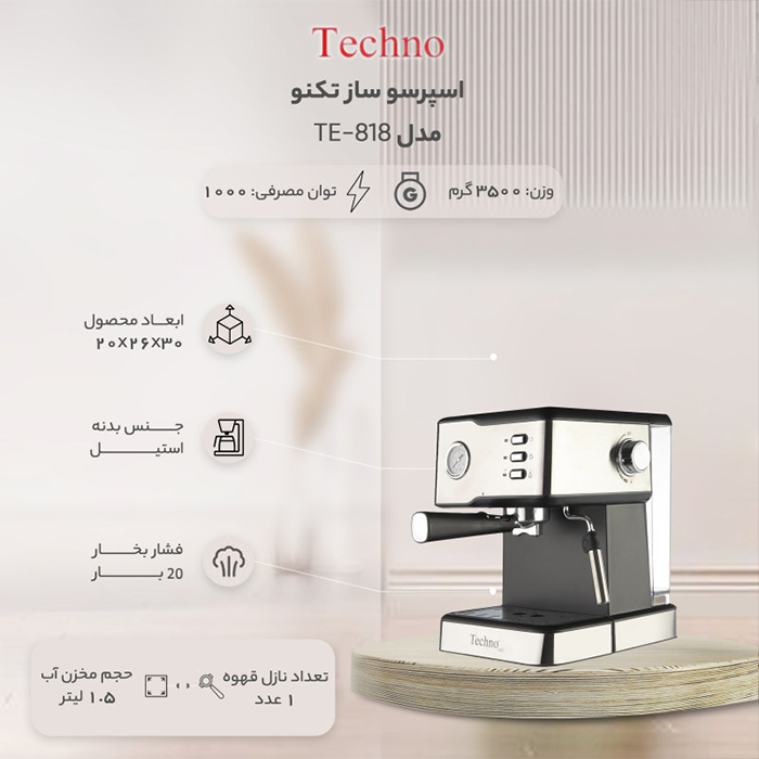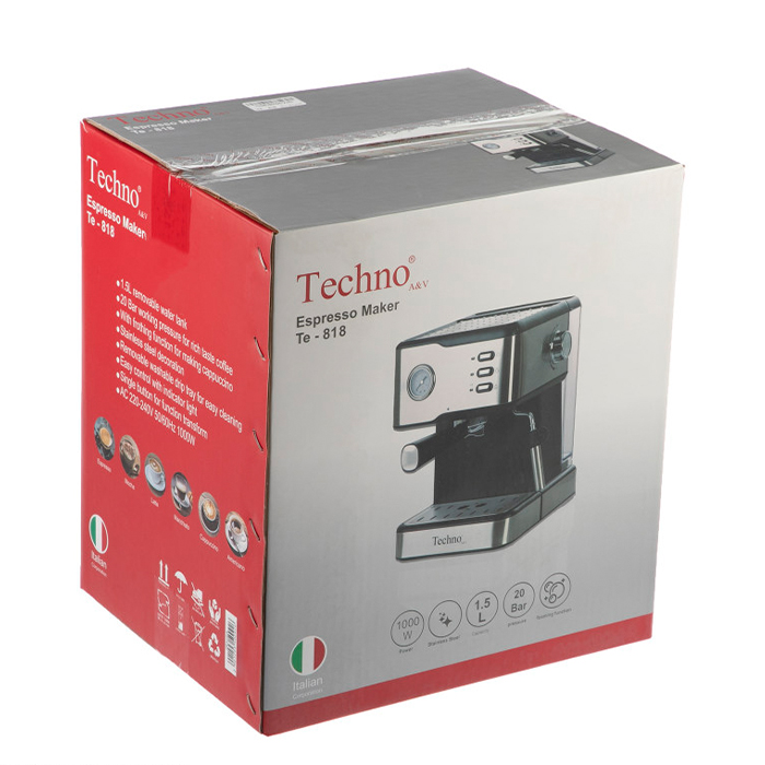 اسپرسو ساز تکنو مدل Te-818 با توان 1000 وات و فشار پمپ بخار 20 بار قادر است، در مدت زمان کوتاهی انواع نوشیدنی هایی همچون اسپرسو، کاپوچینو و لاته را با حفظ طعم واقعی تهیه نماید. همچنین نازلی در کنار اسپرسو ساز تکنو مدل Te-818 جهت تهیه کف شیر برای کاپوچینو تعبیه شده و سینی آن به صورت متحرک و چکه گیر می باشد که مانع از چکیدن مایعات از دستگاه می گردد.