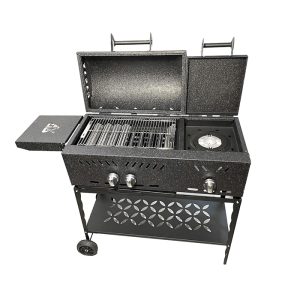 توری گریل تولید شده از ورق 4 میلیمتر فولادی با ظاهری زیبا و با پوشش کروم و طراحی منحصر به فرد که در زمان 5 ثانیه جهت تمیز کاری و شستشو از باربیکیو جدا و به آسانی وصل می گردد .درب دوجداره باربیکیو گازاکس مدل 9040 تولید شده از فولاد و استنلس استیل و حرارت سنج درجه یک وارداتی منقل و آتشدان این باربیکیو بر خلاف باربیکیو های دیگر که با رنگ پوشش داده شده لعاب کاری شده و به هیچ عنوان نمیسوزد