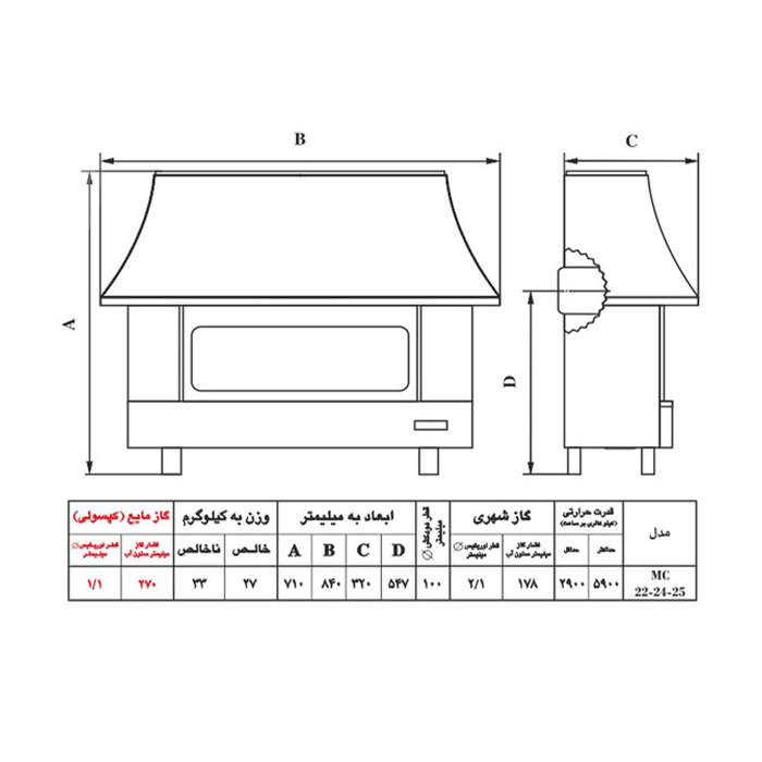 بخاری گازی شومینه ای نیک کالا مدل ثمین MC25 با روکش لعاب نسوز طراحی شده که زیبایی خاصی به دکوراسیون محیط خانه و یا محل کار می بخشد. این بخاری با گاز شهری تنظیم شده است و چنانچه الزاما تصمیم به استفاده از گاز مایع (کپسول) داشته باشید باید تغییراتی در سیستم سوخت بخاری (پیلوت، اوریفس، …) به عمل آید که این امر باید حتما توسط سرویس کاران آموزش دیده (مجاز) نیک کالا انجام شود.