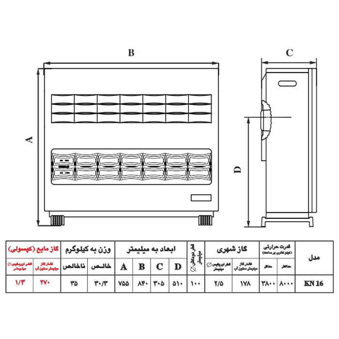 بخاری گازی نیک کالا مدل کیوان KN16 با طراحی زیبا و تمام لعاب با شیشه سکوریت برنزی و سفید سیلک شده و دو چاپ ، یکی از محصولات تولید شده توسط کمپانی نیک کالا و طبق استاندارد ملی ایران ، استاندارد CE و TSE می باشد.
