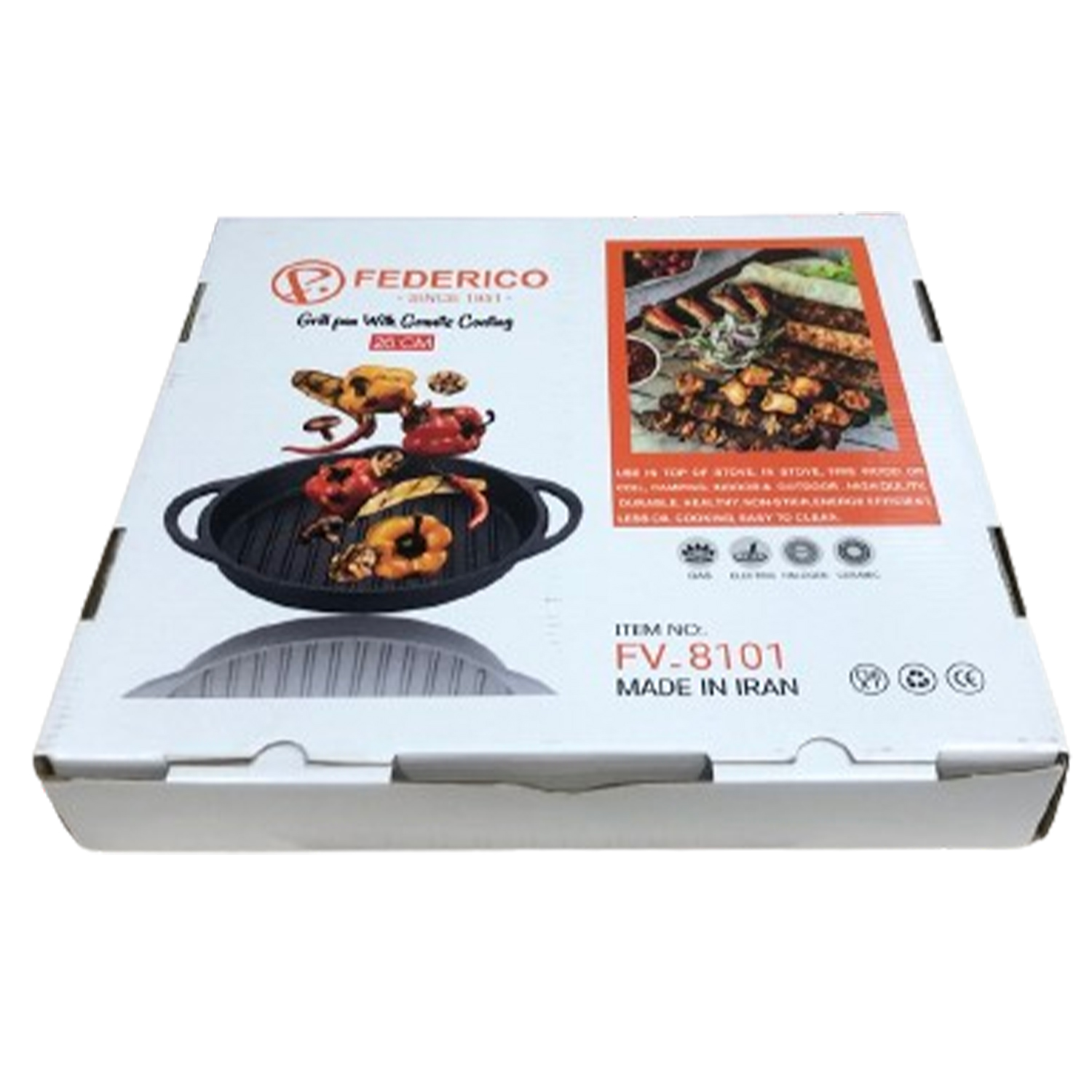 تابه گریل چدنی فدریکو مدل FV-8101 بی درب سایز 26 هم با درب پیرکس و هم بدون درب و با پوشش نچسب دیسکاور قابل ارائه می باشد.