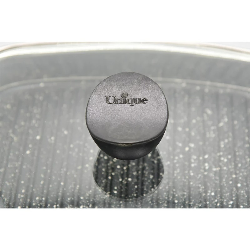 تابه گریل چدن گرد بزرگ بدون چوب یونیک، از جنس چدن با زیره چوبی و درب آن پیرکس و استیل است. این محصول قابلیت استفاده در فر، روی زغال و شستشو با ماشین ظرفشویی را دارد. مناسب طبخ انواع غذاهای رژیمی، گریل استیک و … می باشد. هر دو طرف این تابه قابل استفاده است، یک طرف آن شیاردار و طرف دیگر ساده است. برای مغز پخت شدن کامل مواد غذایی درب تابه به خوبی تمام آن را می پوشاند. تابه گریل چدن گرد بزرگ بدون چوب یونیک یک انبر پلاستیکی نسوز هم به همراه دارد.
