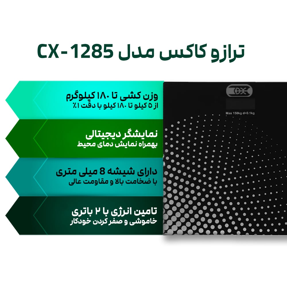 ترازوی وزن کشی کاکس مدل CX-1285 با ترکیب طراحی زیبا، دقت بالا، امکانات کاربردی و خدمات پس از فروش معتبر، انتخابی عالی برای افرادی است که به دنبال یک ترازوی قابل اعتماد و با کیفیت هستند. این محصول با توجه به ویژگیهایی که ارائه میدهد، میتواند نیازهای شما را در زمینه اندازهگیری وزن به بهترین شکل ممکن برآورده کند. اگر به دنبال یک ترازوی دقیق، مقاوم و کارآمد هستید، مدل CX-1285 از برند کاکس گزینهای است که نمیتوانید از آن چشمپوشی کنید.