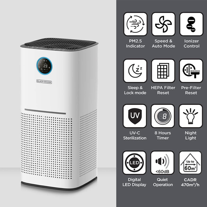 با ورودی هوا 360 درجه، تصفیه کننده هوا ویروس ها، آلرژن ها و یا آلاینده ها را به طور موثر جذب و هوای تمیز را در اتاق های بزرگ توزیع می کند. تصفیه کننده هوا بلک اند دکر مدل AP3560 دارای یک نور UV-C با موج کوتاه است که پاتوژن ها / میکروارگانیسم های موجود در هوا را غیرفعال می کند تا آلودگی هوای داخل خانه کاهش یابد.