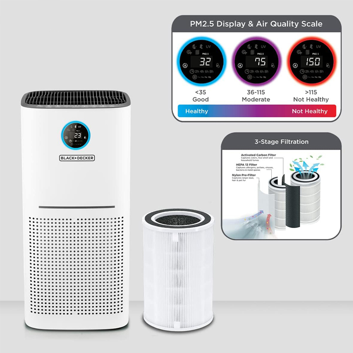 با تصفیه کننده هوا بلک اند دکر مدل AP3560 به آسودگی خاطر هوای پاک را استشمام و از خانه خود محافظت کنید. این دستگاه با برخورداری از توان 55 وات، دارای یک صفحه نمایش کیفیت هوا PM2.5 با یک حلقه رنگی بصری است و کیفیت هوای داخلی در زمان واقعی را نمایش می دهد.