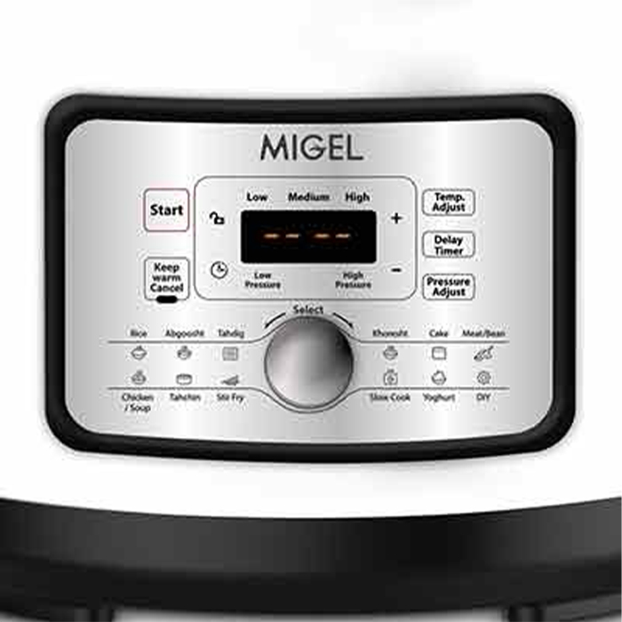 بر روی بدنه زودپز میگل مدل GPC 106، پنل دیجیتالی تعبیه شده که با انتخاب هر کدام از آنها می توان طبخ مورد نظر را آغاز نمود و یا در صورت لزوم، از عملکرد پخت تاخیری 24 ساعته استفاده کرد.