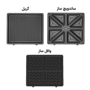ساندویچ ساز گوسونیک سه کاره مدل GSM-706 همانطور که از نامش پیداست 3 نوع صفحه دارد که شامل صفحات ساندویچ ساز، وافل ساز و گریل می باشد. با این 3 مدل صفحه می توانید انواع غذاهای متنوع از جمله اسنک، گوشت استیک، پیتزا و… را درست کنید.