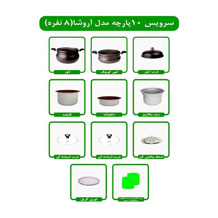 سرویس غذاپز ناخ مدل 10 پارچه 8 نفره آروشا برخلاف تک تنور بودن محصول هشت پارچه دارای دو تنور می باشد و برای همین تفاوت قیمت دارد.این محصول حاصل دسترنج کارگران و مخترعان ایرانی می باشد.