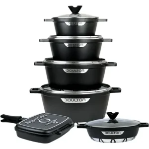 تمامی قابلمهها و تابهها سرویس قابلمه چدن 17 پارچه دالتون مدل فلورانس دارای درب پیرکس مقاوم هستند که به شما این امکان را میدهند تا وضعیت پخت غذا را بدون نیاز به برداشتن درب مشاهده کنید. این دربها علاوه بر محافظت از حرارت و بخار در داخل قابلمه، به حفظ طعم و عطر غذا نیز کمک میکنند. همچنین، تمامی قابلمهها دارای پوشش نچسب هستند که باعث میشود غذا به سطح قابلمه نچسبد و شستوشوی آن بسیار آسان باشد.