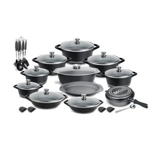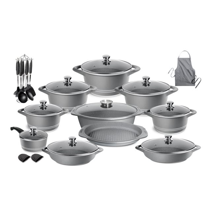 قابلمه سایز 36، سایز 32، سایز 28، سایز 24، سایز 20، سایز 16، تابه دو دسته سایز 28، تابه رژیمی سایز 28، مرغ پز 3 تکه، 7 عدد کفگیر و ملاقه، 4 عدد دستگیره و پیشبند