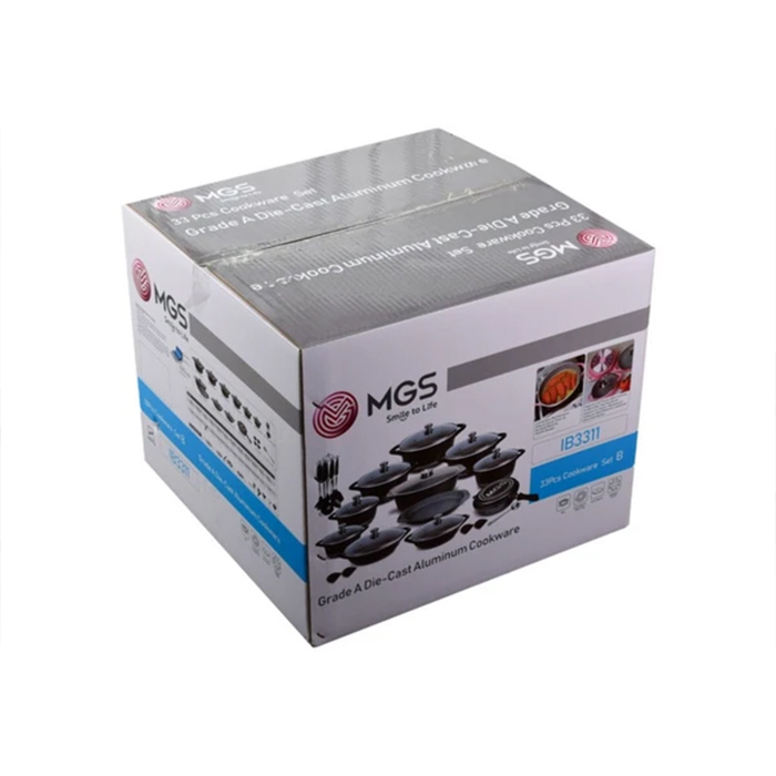 سرویس قابلمه 33 پارچه MGS طرح ایتالیا B شامل قابلمه سایز 36، سایز 32، سایز 28، سایز 24، سایز 20، سایز 16، تابه دو دسته سایز 28، تابه رژیمی سایز 28، مرغ پز 3 تکه، 7 عدد کفگیر و ملاقه، 4 عدد دستگیره و پیشبند می باشد.