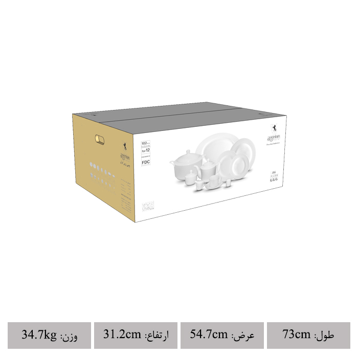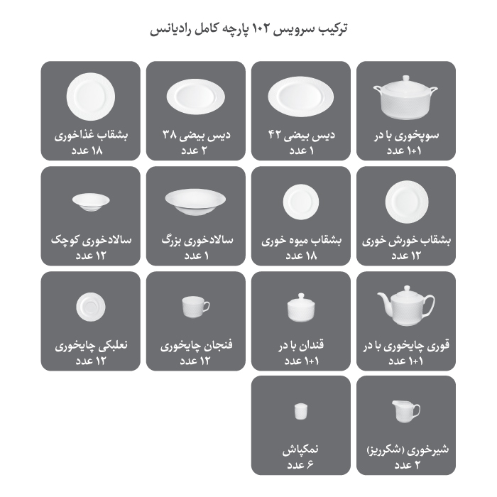 سرویس چینی 102 پارچه زرین سپینود برای پذیرایی و سرو غذا به تعداد 12 نفر تهیه شده و تمام ظروف اساسی و ضروری برای میز غذا را در خود دارد.