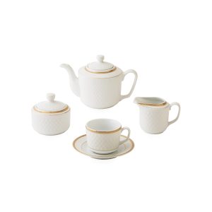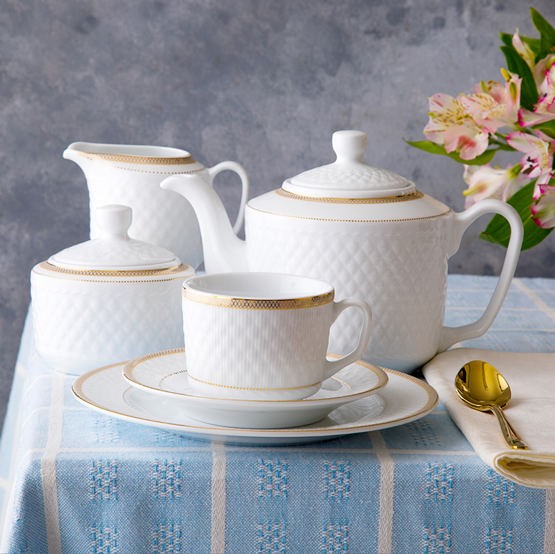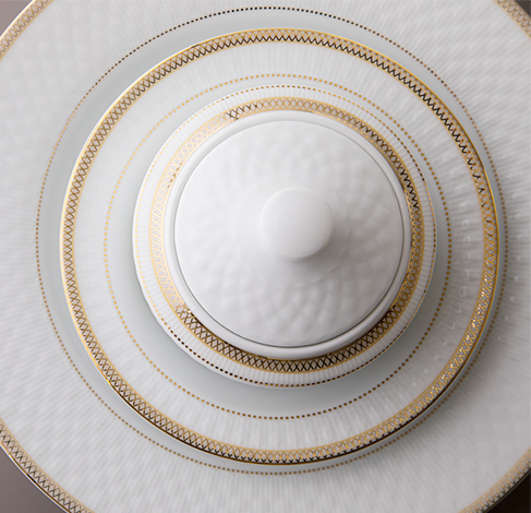 سرویس چینی 102 پارچه زرین سپینود از سری رادیانس که به تازگی در این سال جاری طراحی و تولید شده است مناسب برای پذیرایی از دوازده نفر است و با طراحی طلایی و سفید محو هارمونی جذابی به این طرح داده است.