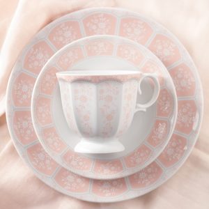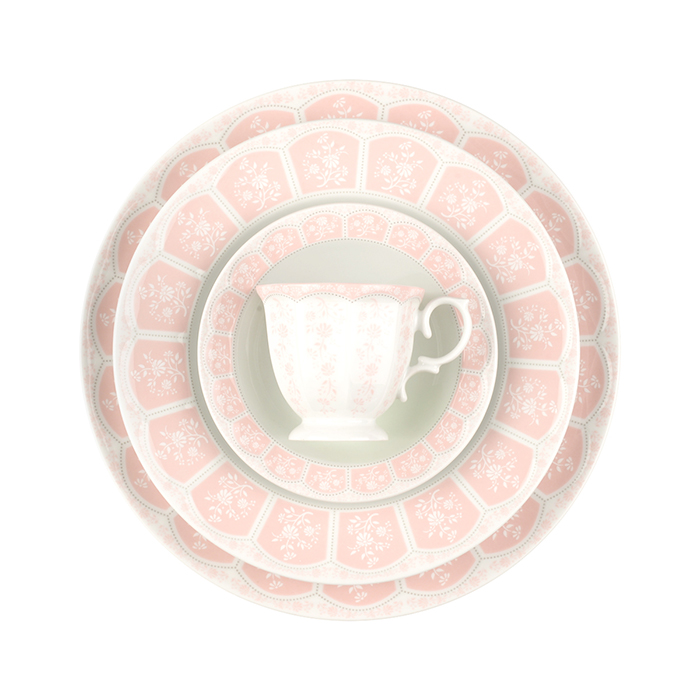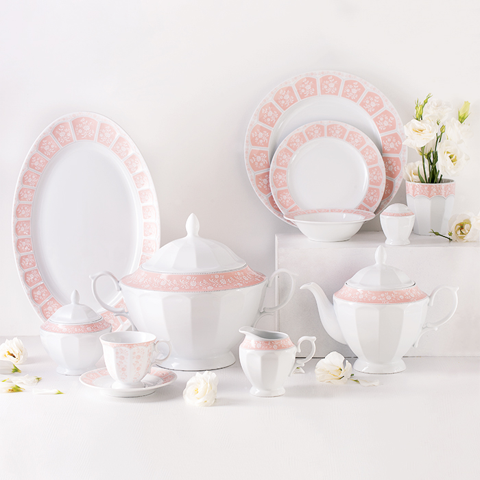 سرویس چینی 103 پارچه زرین آرتمیس صورتی از سری نئوکلاسیک با خطوط نقش و نگار فوق العاده و پیچیده خود که به تازگی طراحی و تولید شده است.