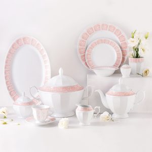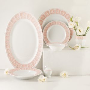 سرویس چینی 103 پارچه زرین آرتمیس صورتی برای پذیرایی و سرو غذا به تعداد 12 نفر تهیه شده و تمام ظروف اساسی و ضروری برای میز غذا را در خود دارد.