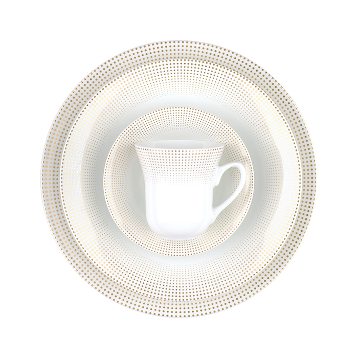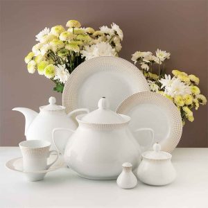 سرویس چینی 108 پارچه زرین طرح مریدین طلایی برای پذیرایی و سرو غذا به تعداد 12 نفر تهیه شده و تمام ظروف اساسی و ضروری برای میز غذا را در خود دارد.