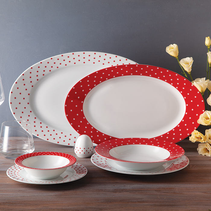 سرویس چینی 28 پارچه زرین اسپاتی قرمز برای پذیرایی و سرو غذا به تعداد 6 نفر تهیه شده و تمام ظروف اساسی و ضروری برای میز غذا را در خود دارد.