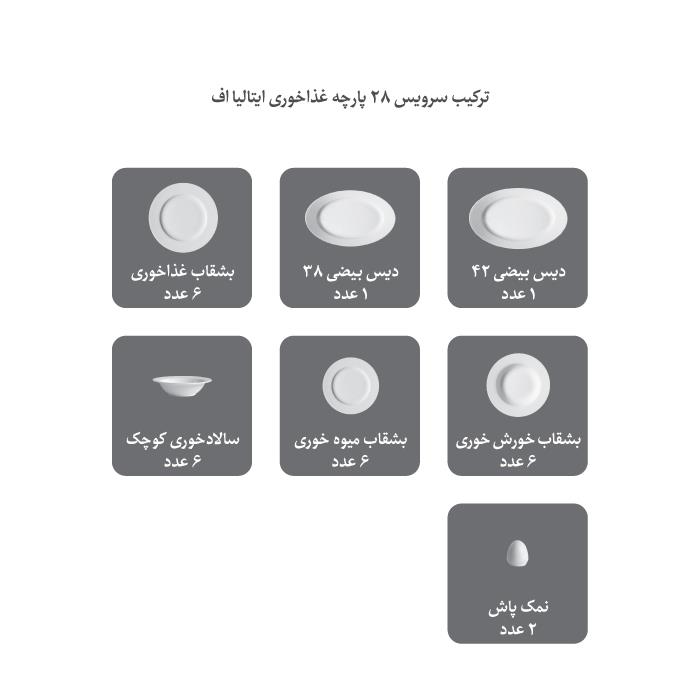 طرح نشات گرفته از خطوط منحنی ملایم در کنار کیفیت بسیار بالای بدنه سرویس چینی 28 پارچه زرین ریوا پلاتینی، تکمیل کننده جذابیت ایتالیا اف می باشد.