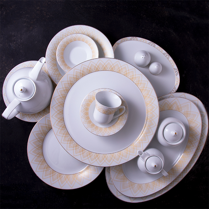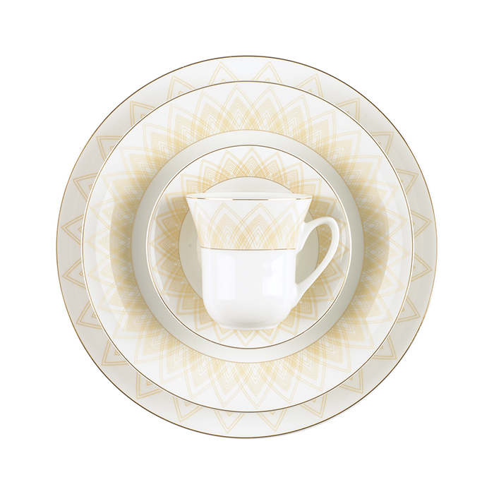 سرویس چینی 81 پارچه زرین میراندا از سری شهززاد که به تازگی طراحی و تولید شده است مناسب برای پذیرایی از دوازده نفر است و لبه ظروف با طراحی خورشیدی و رنگ طلایی مزین شده و هارمونی جذابی به این طرح داده است.