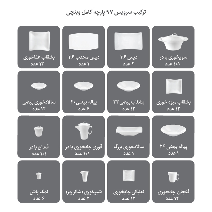 Zarin Vinchi Dinnerware Set -97 PCSدیگران را با نوشتن نظرات خود، برای انتخاب این محصول راهنمایی کنید.