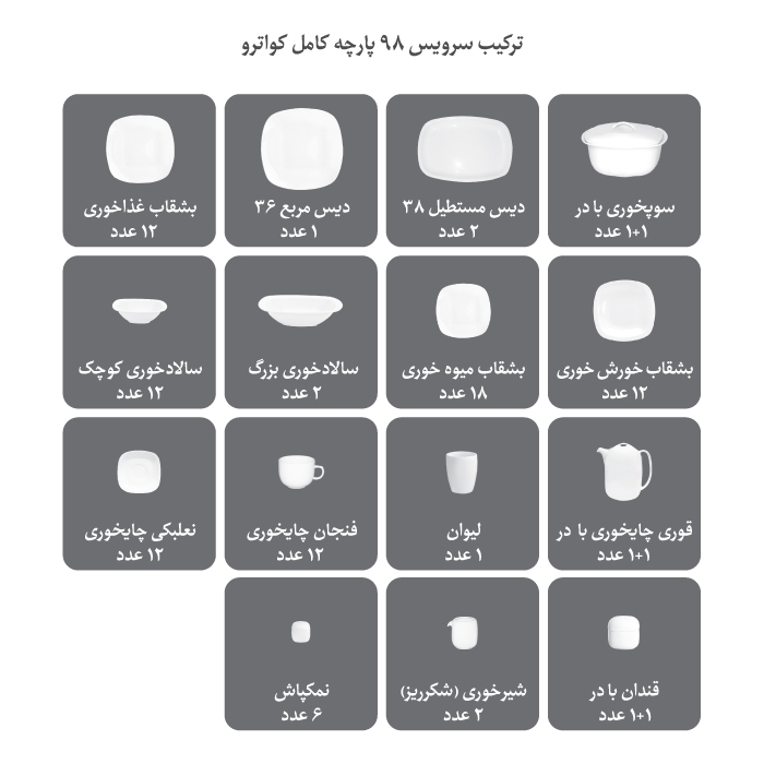 سرویس چینی 98 پارچه زرین وگاس اوریت از سری کواترو با بهترین متریال تولید و به بازار عرضه شده است. افرادی که به دنبال یک سرویس با کیفیت هستند، انتخاب این محصول بهترین و مناسب ترین گزینه برای آنان است.