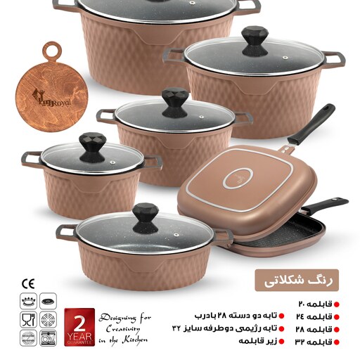 قابلمه سایز 20 ( مناسب برای 5 نفر) /قابلمه سایز 24 ( مناسب برای 7 نفر) /قابلمه سایز 28 ( مناسب برای 9 نفر) /قابلمه سایز 32 ( مناسب برای 12 نفر) با درب پیرکس تابه سایز 28 با درب پیرکس تابه دوبل رژیمی سایز 32 به همراه زیر قابلمه ای چوبی