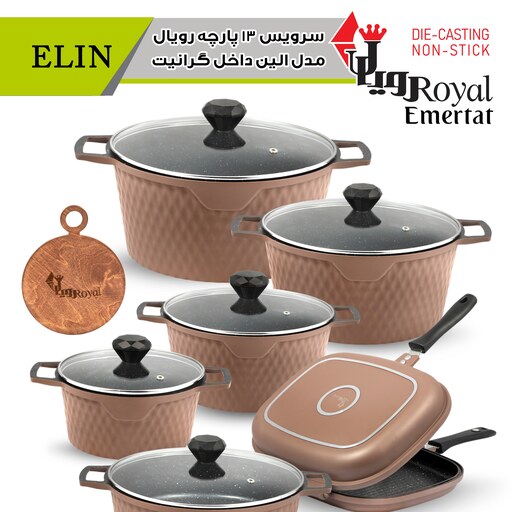 سرویس 13 پارچه چدن رویال مدل الین یک سرویس شامل تابه، قابلمه و کفگیر و ملاقه و زیر قابلمه ای چوبی است که نیاز های پخت و پز آشپزخانه شما را پوشش می دهد. دسته های قابلمه های این سرویس از جنس بدنه و با روکشی عایق حرارت و نسوز هستند. درب ها از شیشه با لبه استیلی هستند که به خوبی روی ظرف کیپ میشوند.داخل این ظروف با روکشی گرانیت پوشیده شده. این روکش علاوه بر نجسب بودن، نسبت به تفلون سالم تر وبادوام تر است. لطفا در هنگام آشپزی از کشیدن قاشق فلزی به داخل ظروف روکش دار خودداری کنید.استفاده از قاشق های چوبی یا سیلیکونی طول عمر ظروف را افزایش میدهد.این سرویس دارای قابلمه چدنی نچسب سایز 32، قابلمه چدنی نچسب سایز 28، قابلمه چدنی نچسب سایز 24، قابلمه چدنی نچسب سایز 20، تابه درب دار سایز 28، یک عدد تابه رژیمی دو طرفه(2 پارچه) سایز 32 میباشد.