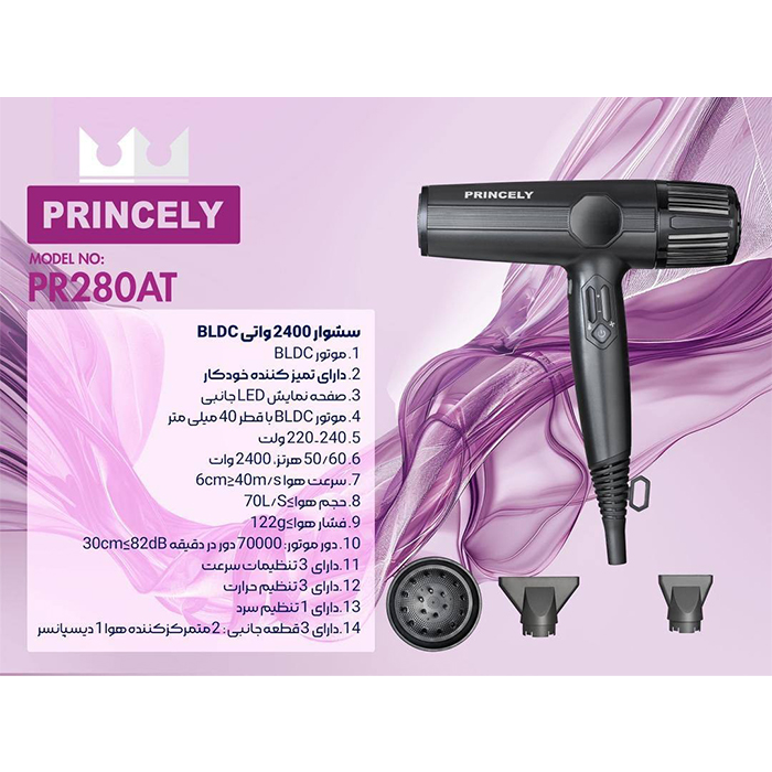 سشوار پرنسلی مدل PR280AT دارای موتور BLDC می باشد این نوع موتور میتواند به صورت خودکار خود را تمیز کنید