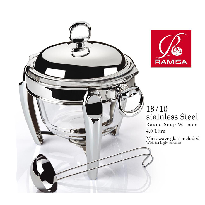 سوفله سوپ خوری نقره ای رامیسا دارای پایه استیل،درب استیل،ظرف پیرکس و ملاقه است و تحمل ۳۰۰ درجه سانتیگراد حرارت دارد