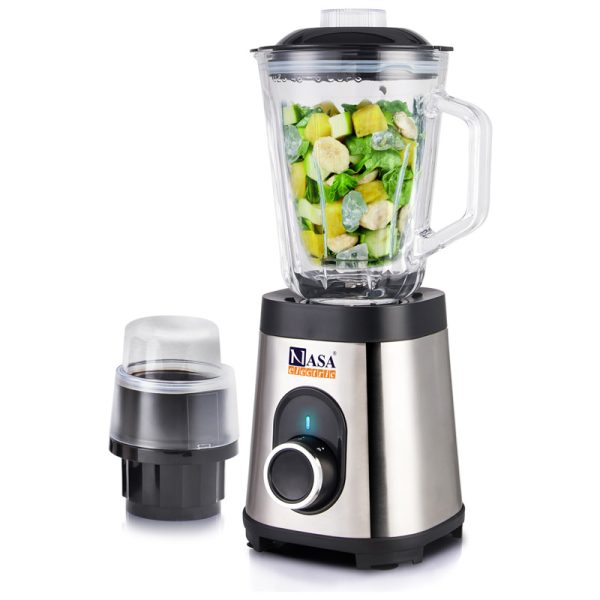 مخلوط کن و آسیاب ناسا الکتریک NS-1962 یکی دیگر از محصولاتی است که در گروه لوازم برقی آشپزخانه قرار دارد. این محصول امکان تهیه انواع نوشیدنی و اسموتی و دسر و پودر کردن و خرد کردن دانههای مختلف نظیر قهوه و گردو و پسته و بادام و انواع خشکبار و … را برای شما فراهم میآورد. موتور قدرتمند تعبیه شده برای این مخلوط کن دارای توان 800 واتی میباشد و از قدرت و سرعت مناسبی بهره میبرد. قابلیت تنظیم سرعت در دو سطح 1 و 2 یا همان کم و زیاد را دارد، هر یک از این سرعتهای انتخابی بر روی عملکرد دستگاه تاثیر گذاشته و سرعت مخلوط کردن و آسیاب کردن مواد را افزایش یا کاهش میدهند. کافی است دکمه ولومی تعبیه شده بر روی بدنه بچرخانید و سرعت مورد نظرتان را انتخاب کنید. همچنین عملکرد پالسی که برای این مخلوط کن در نظر گرفته شده، امکان افزایش و بهرهوری از حداکثر کارآیی دستگاه را فراهم آورده است و برای یک لحظه از حداکثر قدرت موتور بهره میبرد.