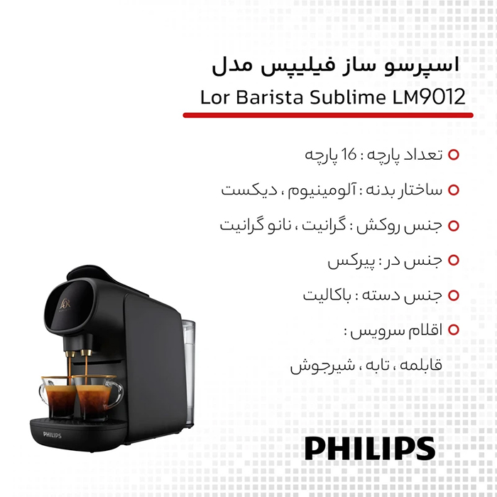 نسپرسوساز فیلیپس مدل LM9012 با طراحی ظریف و جمع و جور مناسب برای هر فضا و سبک زندگی میباشد.با لمس فقط یک دکمه یک باریستا حرفهای شوید و قهوههای متنوعی بسازید.این دستگاه با فشار بخار 19 بار کیفیت واقعی اسپرسو را تضمین میکند.