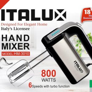 همزن دستی ایتالوکس محصولی زیبا و ایمن با توان مصرفی 800 وات، محصول با کیفیت برند خوش آوازه ایتالوکس بوده که به واسطه دارا بودن ویژگی هایی چون عملکرد توربو و تنظیمات سرعت 6 حالته، جنس پره استیل ضد زنگ و همچنین دارای 2 عدد میله متفاوت همزن، همچنین مجهز به سنسور ایمنی جهت حفاظت، کالایی با کیفیت تحت لیسانس ایتالیا.