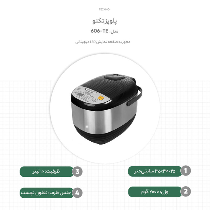 تایمر قابل تنظیم 24 ساعت و قابلیت گرمنگه دارندگی از دیگر ویژگی های قابل توجه پلوپز تکنو مدل Te-606 است و برای علاقمندان به آشپزی که به دنبال راه آسان برای پخت و پز هستند، انتخاب ایده آلی می باشد.