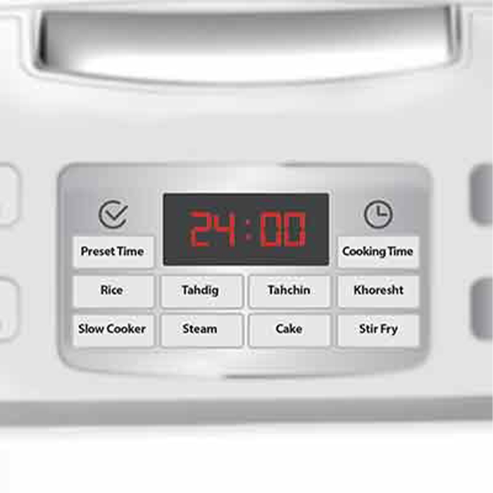 دارای 8 منو پخت ( برنج، ته دیگ، ته چین، آرام پز، بخارپز، کیک، خورشت، سرخ کنی )