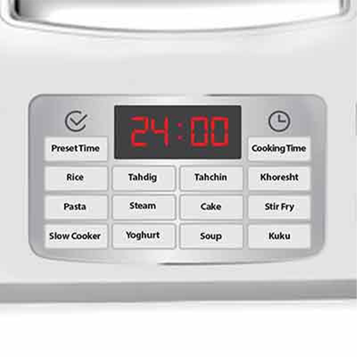 دارای 12 منو پخت ( برنج، ته دیگ، ته چین، خورشت، پاستا، بخارپز، ماست ساز، کیک، سرخ کن، کوکو، سوپ )