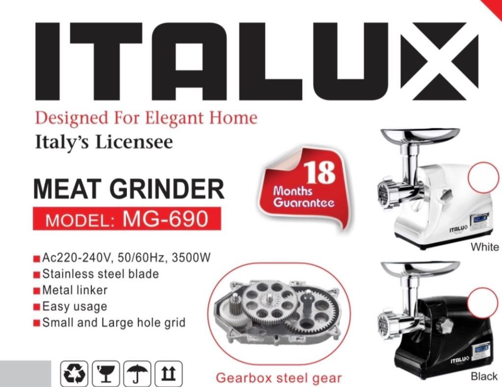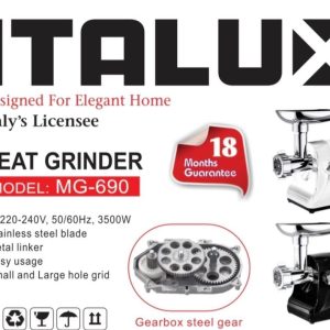 چرخ گوشت ایتالوکس محصولی زیبا و ایمن با توان مصرفی 3500 وات، محصول با کیفیت برند خوش آوازه ایتالوکس بوده که به واسطه دارا بودن ویژگی هایی چون جنس تیغه استیل ضد زنگ، نمایشگر دیجیتال و چرخش معکوس چرخ دنده فلزی، همچنین مجهز به سنسور ایمنی جهت حفاظت، کالایی با کیفیت تحت لیسانس ایتالیا.