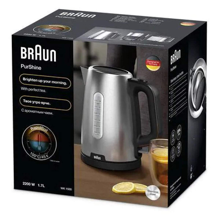 کتری برقی براون مدل WK1500 با قدرت 2200 وات می باشد. بدنهی این دستگاه از جنس استیل ضد زنگ می باشد.همچنین گنجایش این کتری به مقدار 1.7 لیتر می باشد.