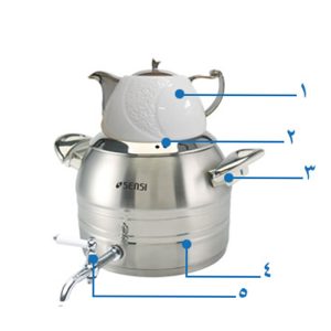 کتری و قوری 7 لیتری سنسی مدل ونتورا کف کپسولى چند لایه استیل / آلومینیومى / استیل ضخیم براى صرفه جویى انرژى و پخش یکنواخت گرمادستگیره هاى باکالیت با محافظ شعله براى خنک ماندن و جابجایى آسان کتریشیر بلند و عریض براى استفاده راحت و گرفتگى کمتر