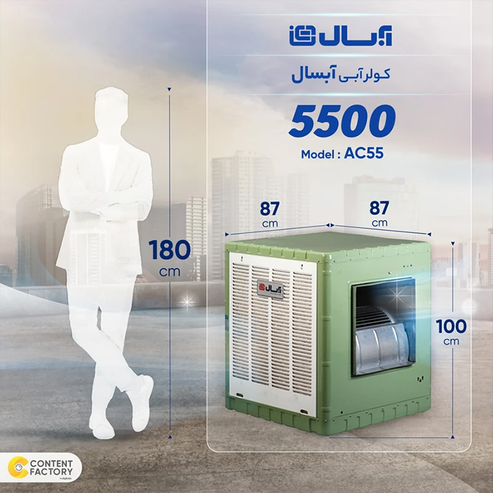 کولر آبی 5500 آبسال مدل AC55 را به موتوری با قدرت 1/2 اسب بخار و حداکثر میزان هوادهی 6650 متر مکعب در ساعت (3900 فوت مکعب در دقیقه) تجهیز نموده است و برای نصب در پشت بام ساختمان مناسب می باشد.