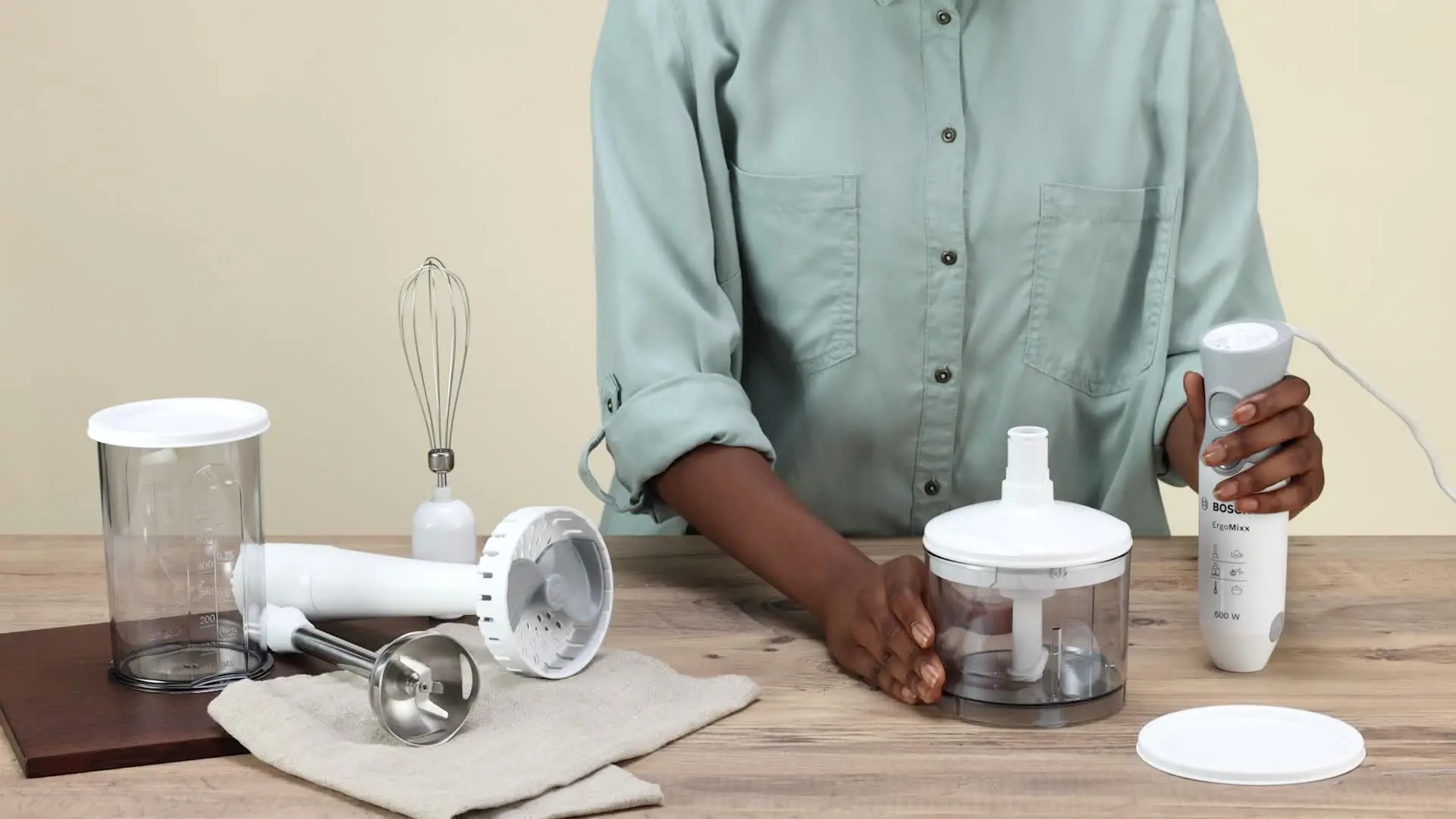 همراه دستگاه گوشت کوب برقی بوش مدل MSM66155، مجموعهای کامل از لوازم جانبی ارائه میشود: یک خردکن برای گوشت یا سبزیجات، پایه پورهساز برای تهیه غذاهای نرم، همزن بالونی برای زدن تخممرغ یا خامه، و یک لیوان مدرج 600 میلیلیتری برای مخلوطکردن سریع.